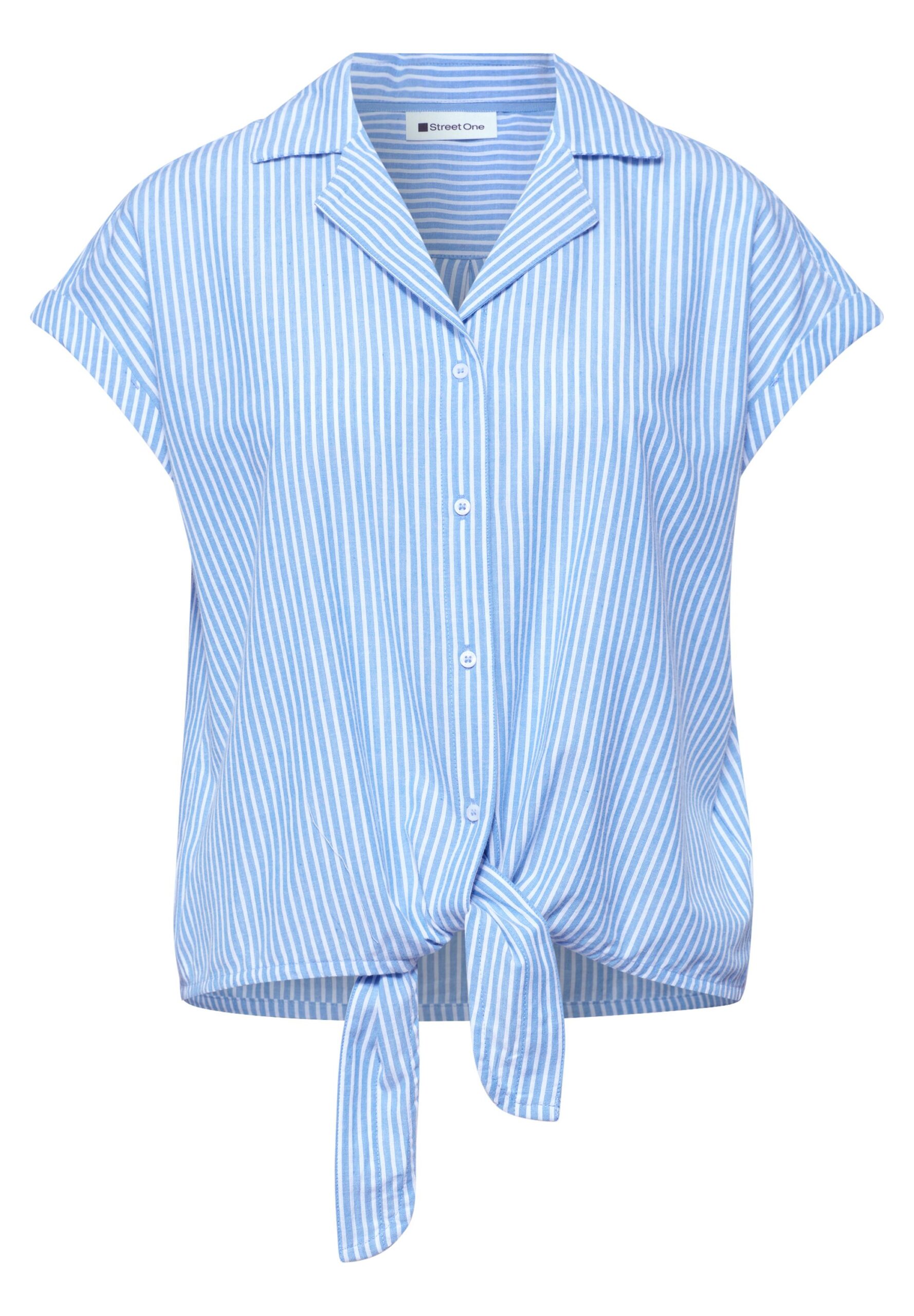 Die Bluse von Street One für Damen überzeugt mit einem frischen Streifenmuster und sportiver Ausstrahlung. Der Bowling-Kragen, der Split Neck und die Dropped Shoulders sorgen für eine entspannte Silhouette. Vielseitig und modern durch das Knotendetail und die Knopfleiste. Aus leichter Viskose für angenehmen Tragekomfort.