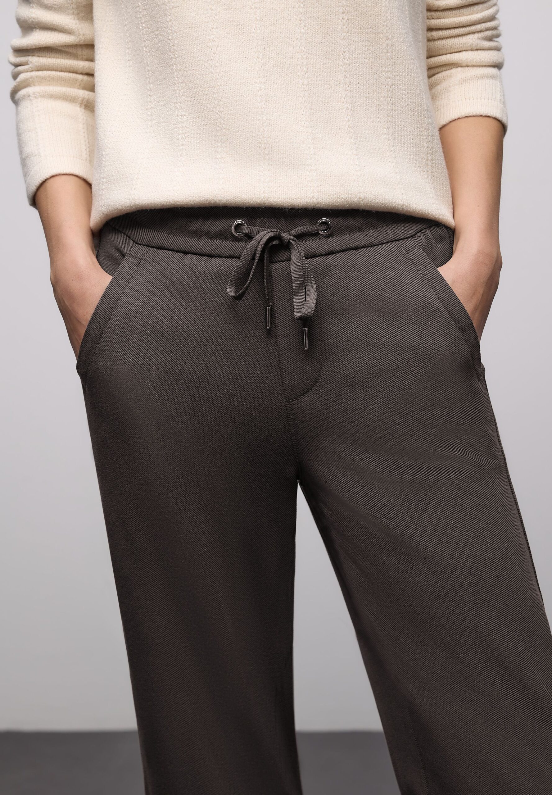 Die Hose von Street One für Damen zeigt sich im Casual Fit mit Mid Waist und geradem Beinverlauf. Tape-Details an den Seiten setzen modische Akzente. Der elastische Bund mit Tunnelzug und seitliche Taschen sorgen für Tragekomfort und Funktionalität. Ideal für sportive Alltags-Looks.