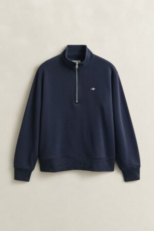 Dieses Sweatshirt kommt im Relaxed Fit. Daher sollten Sie es eine Größe kleiner bestellen, wenn Sie eine körpernahe Passform bevorzugen. Der Kragen verfügt über einen Reißverschluss. Zusätzlich sind Rippenbündchen an Ärmeln und Saum vorhanden. Die grafische GANT-Stickerei auf der Brust verleiht dem Sweatshirt einen besonderen Look. Bitte waschen Sie das Sweatshirt mit ähnlichen Farben, auf links und bügeln Sie es ebenfalls auf links.