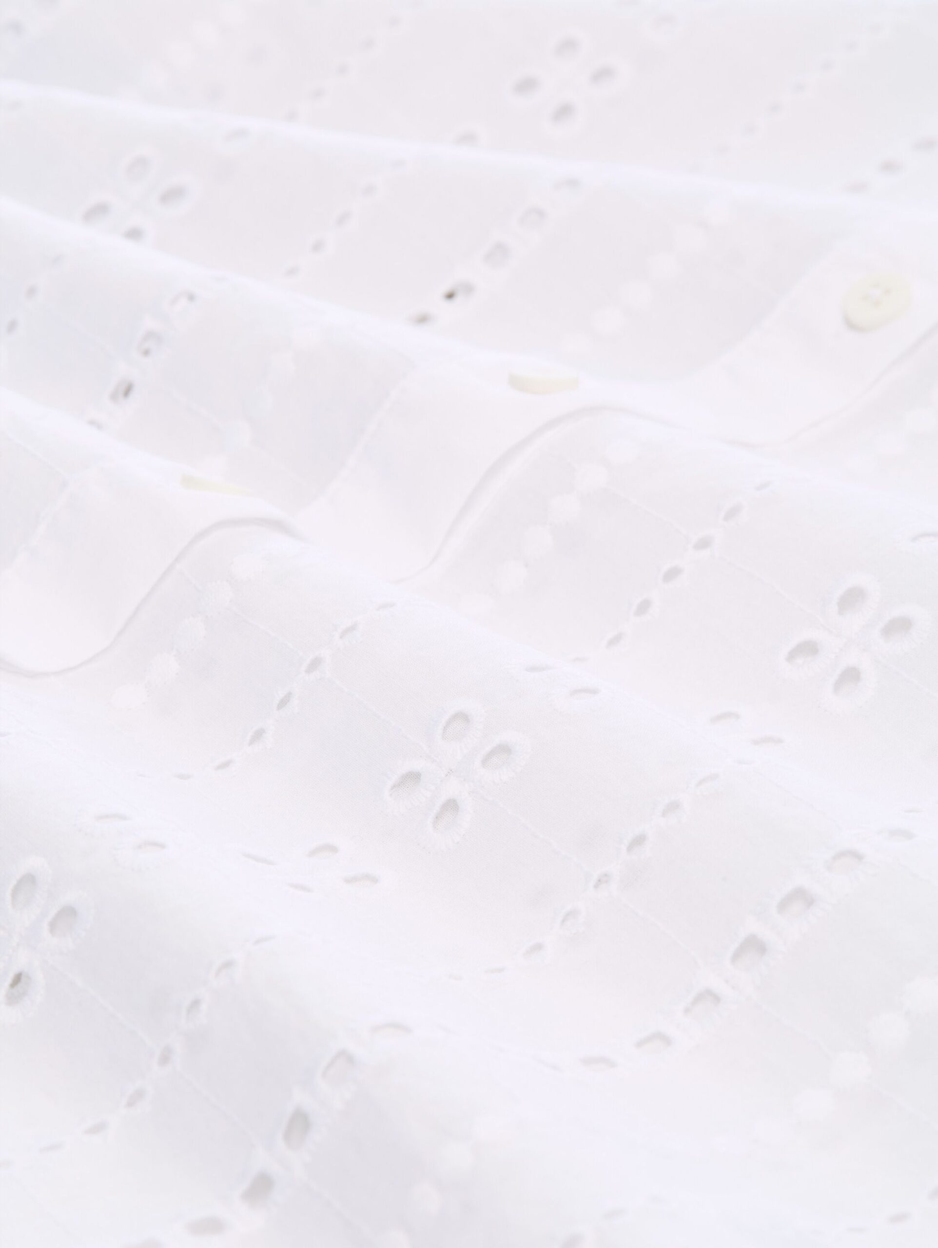 Die Bluse mit Lochstickerei besteht aus reiner Baumwolle und verfügt über einen Kentkragen sowie eine Knopfleiste zum Schließen. Ein stilvolles und feminines Kleidungsstück für verschiedene Anlässe.
