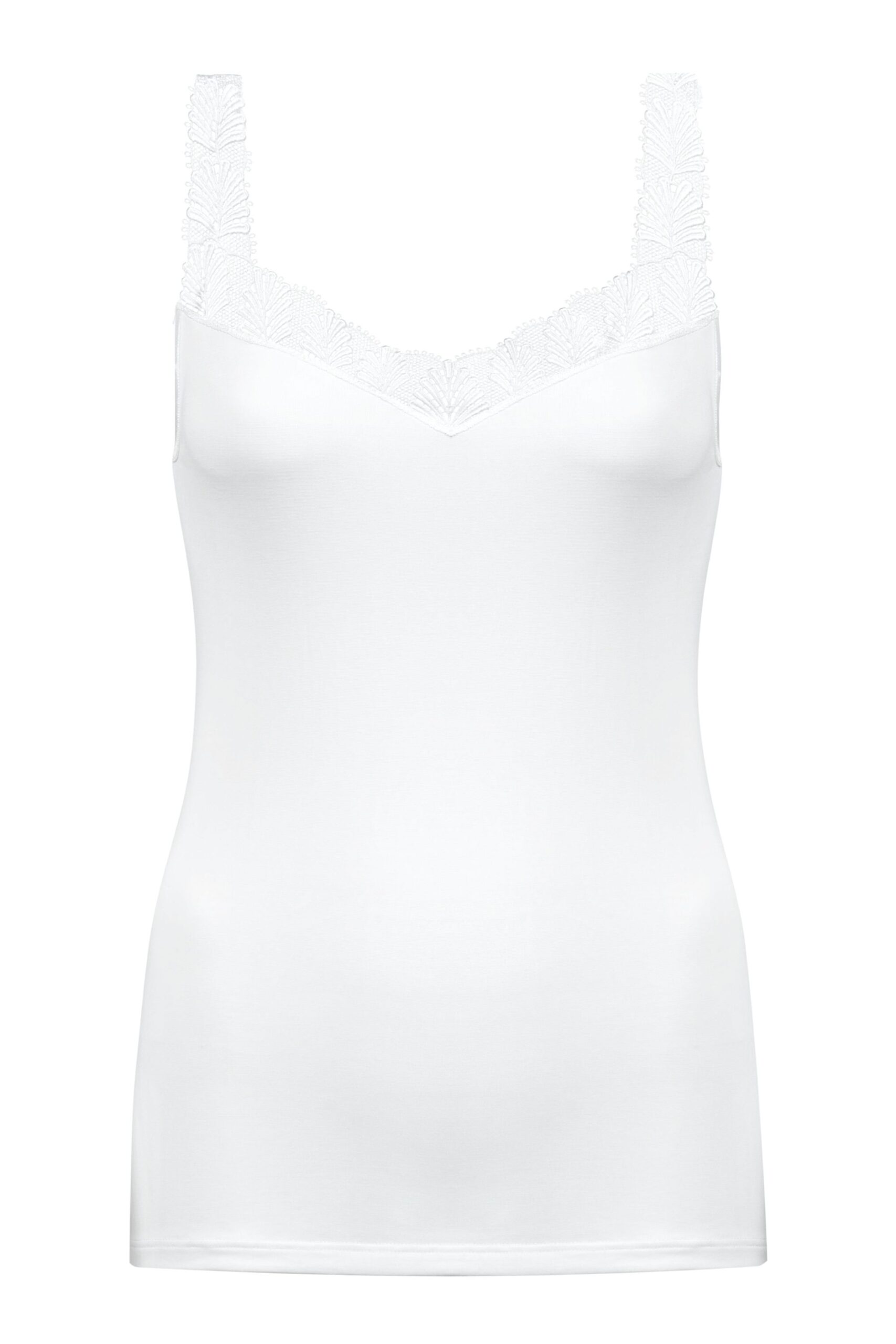 Schmales Top mit leichtem V-Ausschnitt und gestickter Spitze. Die breiten Träger sind vorne komplett aus Spitze gefertigt, während der Rücken rund geschnitten ist. Hergestellt aus fließender Qualität.